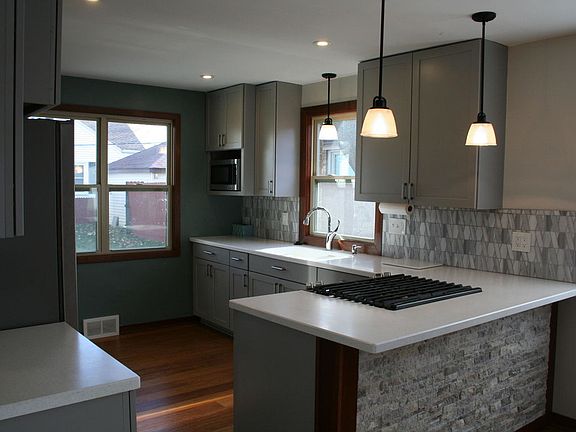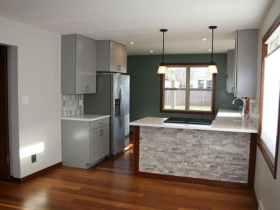 Completely remodeled in 2017, this 2 bedroom brick ranch will surprise you! Hardwood floors throughout. Big living room with custom blinds and lots of windows. Custom designed kitchen with beautiful Corian counter tops, soft close doors and drawers on upgraded cabinets, stove and refrigerator too. 2 generous bedrooms with unique closet doors. Bathroom has unique ceramic tile design in shower, and a fancy vanity. Cedar lined closet in hall. All new light fixtures and doors throughout. Huge back yard is completely fenced in, perfect for the kids and/or dogs, extra storage in shed, newer concrete patio with overhang, great for barbecuing any time of the year. Newer driveway and walkway to a covered front porch. Put this on your must see list!