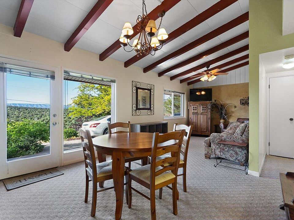 Whether You're Looking for a Charming Mountain Getaway or a Permanent Home in the Pines, This Cozy 2 Bed, 1 bath could be the Perfect Place to Start! Enjoy the Serenity and Picturesque Views of Living up Against the National Forest. There is Hardly any Traffic Noise as the Home is Positioned up off the Roadway, so You can hear the Breeze moving through the Pine Trees and Take in the Sounds of Nature. There is Plenty of Parking with the 2 Car Garage, Large Cement Driveway, and even RV Parking on the Side of the Garage. The Garage includes a Workbench space, Built in Shelves, and an Evaporative Cooler making it Perfect for Working on Projects. Inside, the Split Floor Plan, Vaulted Ceilings, and Large Windows for the Incredible Mountain Views create an Open Feeling. The Beautiful Wood Ceiling Beams and the Gas Fireplace add to the Rustic Charm. Come See it Today!