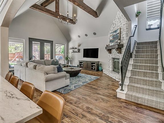 Nestled in the heart of a semi-culdesac, you'll be greeted by a brand new roof and refreshed exterior paint. Inside, hardwood floors, a dedicated office, updated kitchen, and cathedral ceilings in the main living space await you. The downstairs area features three bedrooms, including a primary suite on one side and two guest suites on the other, along with a utility room, office, two full bathrooms, and a powder bath for guests. The primary closet offers a his/her section, while the updated bathroom boasts a soaker tub, his/her vanities, and a makeup vanity. The gourmet kitchen is equipped with double oven, a beverage station inclusive of a wine fridge, a walk in pantry, and updated with stunning finishes. Upstairs leads to a separate bonus room with a walkout balcony overlooking the spacious and private backyard. This room includes ample space for entertainment and play, as well as a full wet bar. Adjacent, the true theatre room awaits, complete with built-in speakers and a projector ready for your summer movie nights. A full bath and a generously sized guest suite are also located upstairs, along with two walkout attic spaces offering plenty of in-home storage. Outside the backyard features an outdoor kitchen, covered patio, extra concrete, full fence with stain and cap, a zip line & outdoor fireplace. IHR is one of the most highly sought after additions in the NE Edmond area. This gated community is stunning with high devotion to community landscaping, a coveted and established HOA, a community clubhouse that’s perfect for hosting large events and parties, fitness center, children’s swimming pool and large resort style swimming pool complete with luxurious waterfalls and cabanas. The community grounds offers several ponds, walking trails, and park.