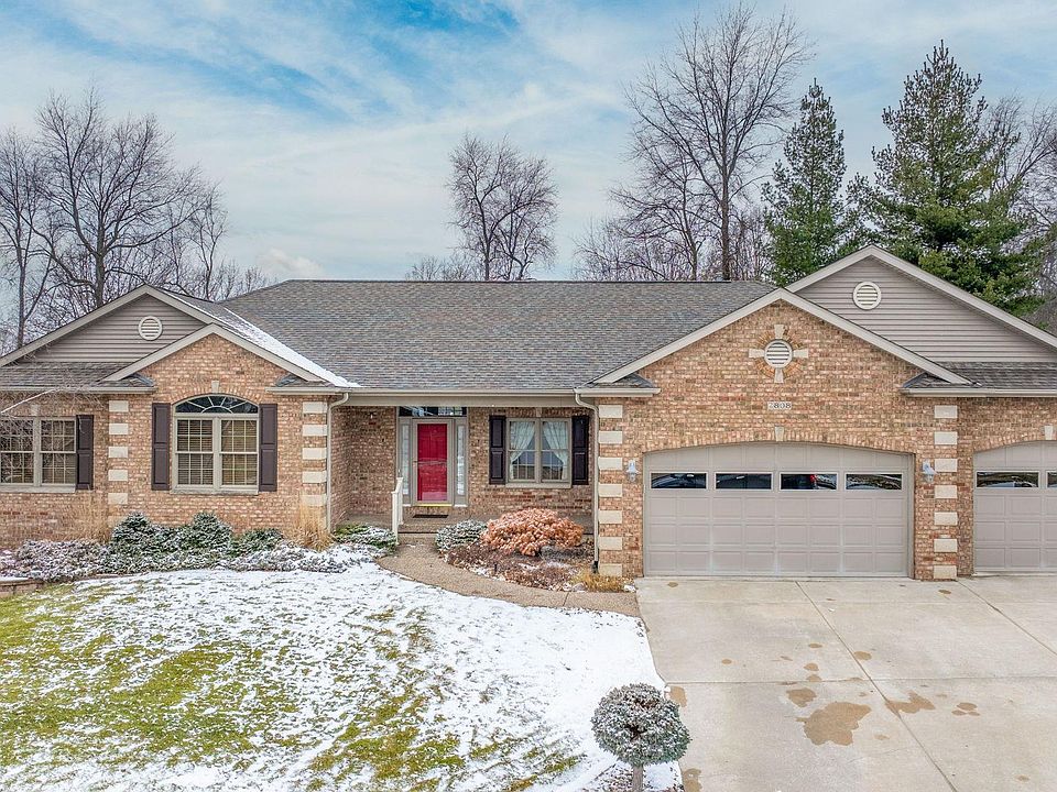 Sprawling custom ranch with over 4,100 square feet finished! 4-5 bedrooms, 4 bathrooms, oversized heated 3 car garage! Vaulted ceiling in the great room with gas fireplace & built in's. Huge kitchen with custom cabinets, granite countertops, breakfast bar, island, pantry & stainless-steel appliances! 4 season room off the back leads to a nice, covered porch & patio with a slider off the 4-season room & primary bedroom! Fenced yard, irrigation system, shed, and gate that leads to Emeis Golf Course! Oversized primary bedroom with attached full bathroom with whirlpool tub & shower, dual vanities, and walk in closet! Main level office or optional 5th bedroom. The finished daylight lower level has a 2nd kitchen, additional bedroom, full bathroom, rec room with dual sided fireplace, built in's & ample storage space. Convenient location near shopping, schools, parks, and interstate access!
