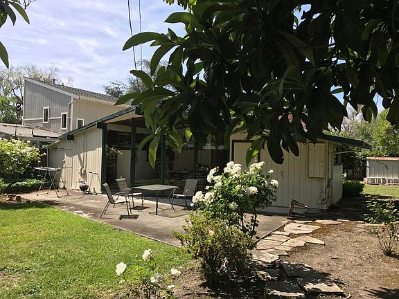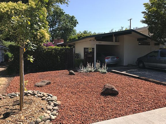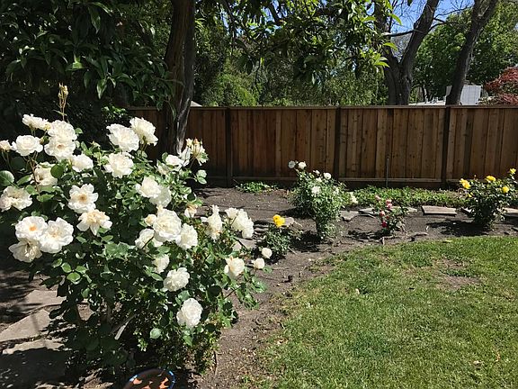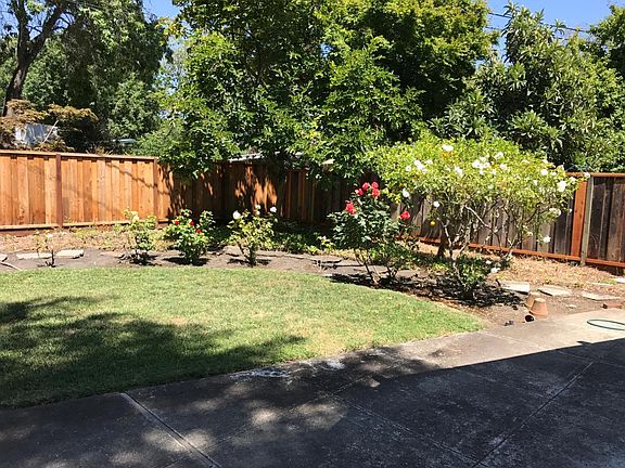Property Id: 23336 Vaulted ceiling with floor to ceiling windows looks out on tidy redwood fenced back yard. Built in bookcase, wood burning fireplace. Multiple skylights. Single-family home built mid-century, renovated and enlarged in 1989. The property has approximately 1,300 sq.ft. living space, 3 bedrooms, with large Master and 2 baths with a lot size of 5,980 sq. ft. Electric baseboards heating, room adjust, foam roof (flat), 4 skylights, washer/dryer, recently replaced refrig, garbage disposal. Laminate flooring in great room (dining room/living room) and hallway, with high ceilings. Wall to wall carpet in bedrooms. Carport, bi-weekly gardening service included. Fruit trees. Shopping (Safeway, Banking, etc.) is within walking distance or an quick bike ride in Midtown Palo Alto. Open to dogs with supplement to deposit and rent.