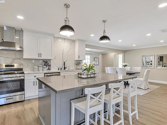 A MUST SEE! Stunning 4 bedrooms/ 3 bathrooms single story home with an office/den and a bonus room (or 5th bedroom), situated in a corner lot location. Gorgeous open concept of a spacious living room to a fully remodeled kitchen with stainless steel appliances, new shaker-style cabinetry, new island with beautiful quartz counter tops and backsplash, new faucets and new sinks. Designer details include new LED recessed lighting in living room, dining area and bathrooms, new LVT flooring and new baseboards throughout. 3 New remodeled bathrooms include all new vanities, tile flooring, shower tiles, faucets, sinks and shower heads. Owner's suite features a large closet with luxurious en suite bath with 2 separate sinks/vanities. Improvements cost of over 200K. Have dual pane windows make indoor quiet and insulate the home from outside noise. Walking distance to award winning San Ramon schools. VIRTUAL TOUR: https://vimeo.com/853239945