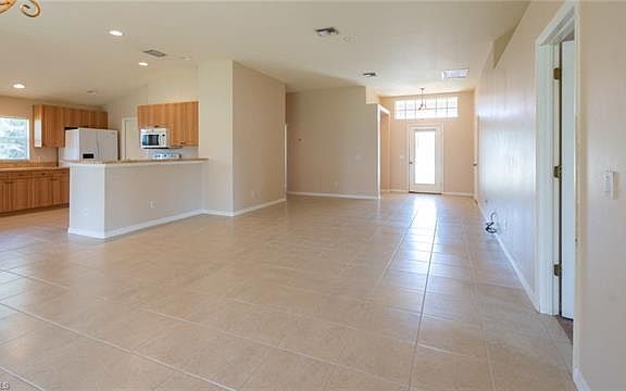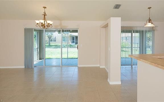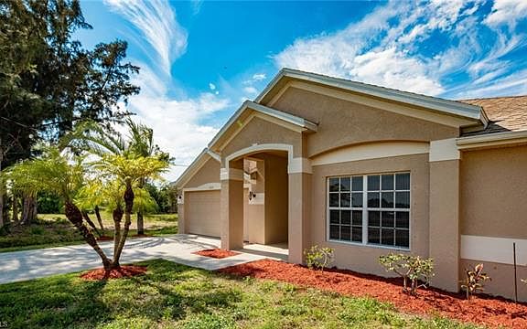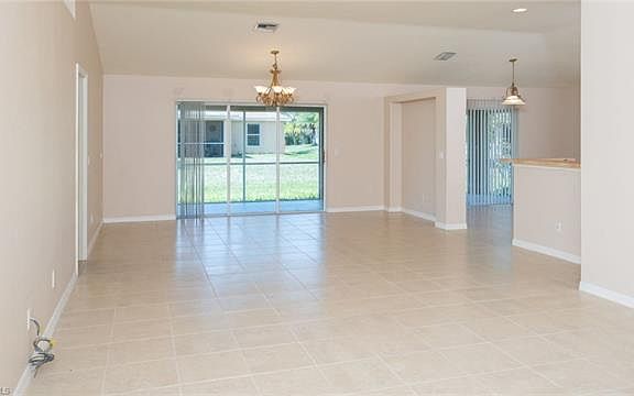READY TO MOVE INTO! Wonderful 3/2 with NEW TILE in the main areas and NEW CARPET in the bedrooms. NEW INTERIOR and EXTERIOR PAINT. Fresh landscaping. Spacious open great room style floor plan with high volume ceilings, split bedrooms, and appliances. The MASTER BEDROOM has volume ceiling and large walk-in closet. MASTER BATH has dual sinks, garden tub, and custom ceramic tiled shower. Guest bedrooms also have walk in closets. This home is 1 block from Christa McAuliffe Charter Elementary School and ACROSS THE STREET FROM 25 ACRE PARK AND LAKE. TENNIS, BASKETBALL. Live in a growing area of Cape Coral. Minutes to GULF ACCESS BOAT RAMP and GOLF COURSES. Lots of shops and restaurants near by including Publix Center. Great first home, retirement home or investment property! This home will be going on city water and sewer. Seller will pay assessments balance of roughly $19,500 off at closing. Buyer to hook up when available.
