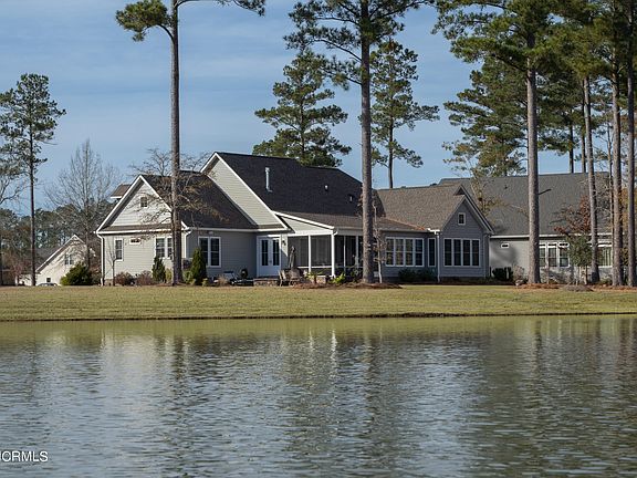 CUSTOM LAKE FRONT TURN-KEY CAPE COD IN CAROLINA COLOURS....this exceptional residence sits on .74 acre on quiet cul-de-sac overlooking Carolina Lake in New Bern's premier master planned golf community Carolina Colours. Massive curb appeal begins with your covered front porch to enjoy sunsets and neighborly hellos. Wake up to nature at your back door with captivating sunrises and moon rises over the lake. This serene setting is the perfect spot for this Energy Star rated amenity rich home. Amenities encompass engineered hardwood flooring, 9' ceilings with trey living room, stacked stone gas fireplace, UV tinted windows in rear to protect flooring. Nest 3 zone heating and cooling. Primary bath tile floor is heated by thermostat and shower has rain head & hand held. Full house Kinetico water purification, under kitchen sink hot water circulator & Rinnai hot water. Living area wired for surround sound system, including in wall subwoofer and in ceiling speakers. Zaytoun kitchen & bath cabinetry, GE Stainless appliances with dual oven, Broan Elite hood, tile backsplash, granite counters, Blanco Siligranit sink and walk in entertainer's pantry off kitchen. Laundry has storage and utility sink. Garage includes dual ceiling fans, industrial grade epoxy flooring, a 3rd bay for golf cart, shelving. Exterior features include Pella windows, a whole house Kohler generator, screened in porch w/industrial grade epoxy flooring, low maintenance vinyl shake siding with stacked stone foundation Leaf Filter on all gutters w/warranty. Outdoor kitchen built in 2021 free form stamped concrete with Ooni natural gas pizza oven, refrigerator, trash and a Blaze grill, oh and don't forget the built in fire pit and it's wired for outdoor sound. Tasteful landscape completes this one of a kind property. HOA includes walking and biking paths, tennis, pickle ball, outdoor pool, fitness center, playground. Community dinners/golf at add fee. Close to downtown, medical, grocery and beaches.