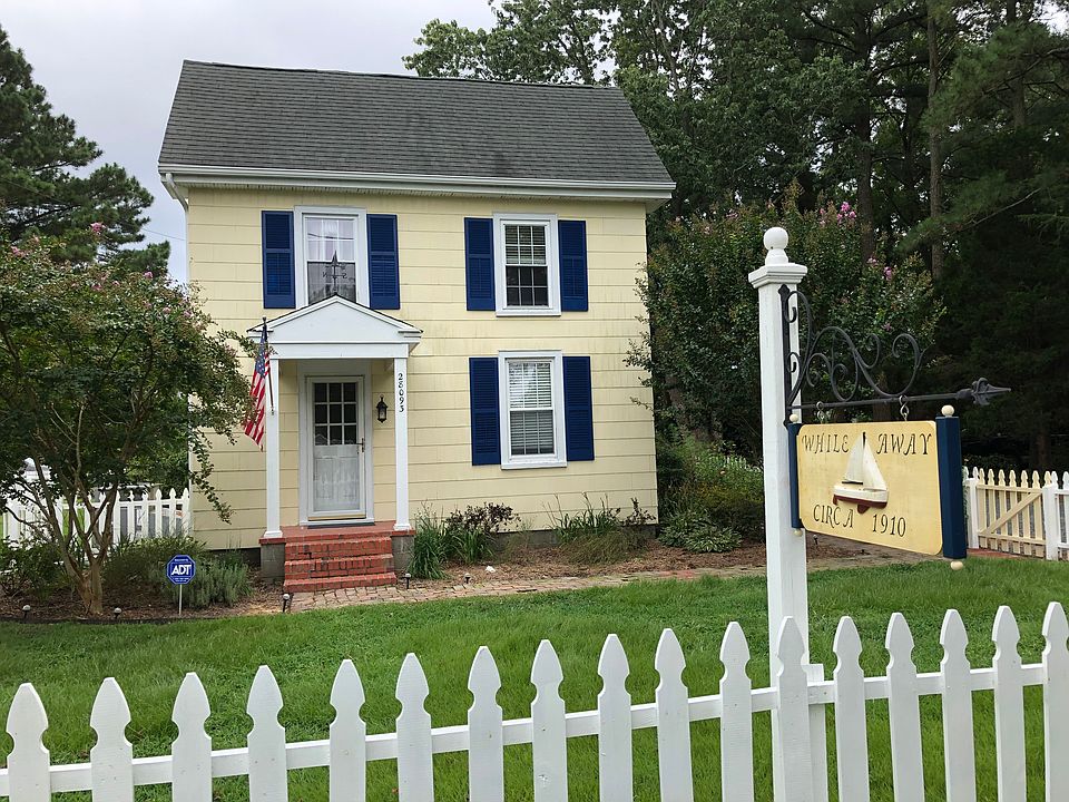 "While Away" is a charming Eastern Shore 1,718 sq. ft. cottage, surrounded by a white picket fence, multiple flower gardens and a Concord grape arbor. Antique Cedar shutters, painted midnight blue, were added to the cheerful yellow exterior of the home in 2018. Features include a light filled 18'x12' sunroom; 16'x16' dining room (recently painted); 18'x14' living room (recently painted); 16'x16' kitchen and three bedrooms: 14'x12', 12'x14' and 9'x12'. In addition a new bathroom with marble floor and tiled shower has been built upstairs and there is a large full bathroom downstairs. The kitchen has a Frigidaire five-burner gas range and a Kitchen Aide side-by-side refrigerator with freezer and ice maker. The top floor attic is expansive and fully floored. Separate laundry room on 1st floor. The quarter acre, plus, lot has a large workshop with electricity (refrigerator does not remain) and a 25' wide driveway to accommodate cars and watercraft. A new well pump was installed in 2018, double pane replacement windows installed and the shingled roof is 11 years old. Gutters were added in 2018. The cottage is in very good condition and is being sold "as is". High speed internet is available. Easy to show.