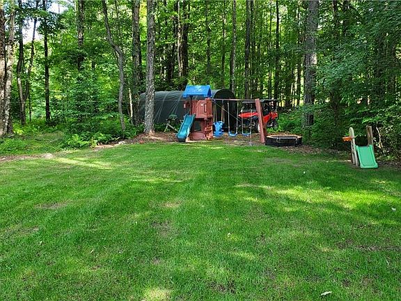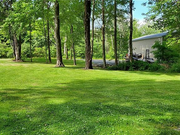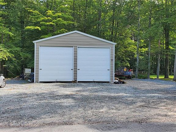 Cozy ranch home on a level corner 2 acre lot. New roof and windows. Sit under your covered porch overlooking your front yard. Upon entry you have open floor plan, living room with sliders out to back deck along with pellet stove for additional heat. Dining room with large serving window into the kitchen. Very nice size kitchen with plenty of counter space and cabinets for storage. Down hall are 2 large bedrooms both with hardwood floors. Main suite with on suite full bathroom, features new vanity, whirlpool tube and tiled wall. Second bedroom also offers large walk in closet and second full bathroom with stall shower. Full basement with updated boiler and oil tank inside out of ground. House offers 2 car attached garage and paved driveway. In addition is a detach steel 2 car oversized garage, great for toys or equipment.