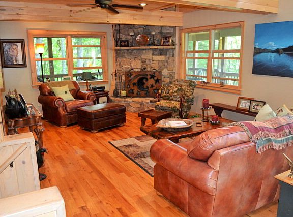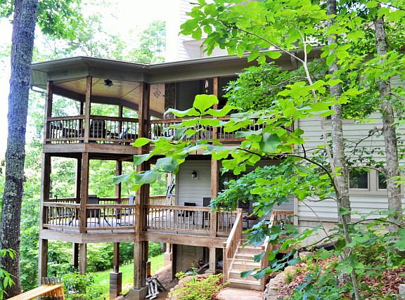 Immaculate mountain home in gorgeous setting. Custom built home with upscale appointments and luxury features. Custom cabinets and granite counter tops. Gourmet kitchen. Beautiful woodwork throughout. Wonderful layout with the master, living and dining rooms on the main and 2 lower level bedrooms with separate living area and kitchenette below. 2 story wrap around porches give views from all angles. Great views of the Cowee Range to the west with wonderful sunsets and Lake Glenville views to the south. Double stone fireplace on the deck gazebo. Great landscaping throughout the property and stone walls surrounding. Flower beds and raised planters. Two car garage/workshop. Cooking deck off of kitchen perfect for grilling. Very well thought out design with an unmatched attention to detail.