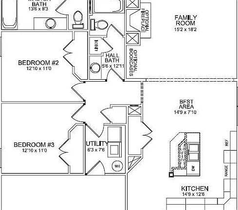 The Carolina is an elegant ranch design that creates street appeal with a stepped roof design, covered entry, a brick front with shake siding accents, and an imposing trio of windows with a radius window. Upscale design elements include a full two-car garage, nine-foot ceilings throughout, a covered rear patio, upgrade master bath options, kitchen island with bookcase, pass-through mudroom/utility room, and family room with optional fireplace and bookcase layout. The kitchen, breakfast area, and family room all open to one another, while the secondary bedrooms share a semi-private hall and a hall bath that is designed to accommodate multiple users as well as double as a powder room. The master suite has a tray ceiling, and formal double doors open to the master bath and huge walk-in closet. The base design includes a linen closet and enclosed commode area, and the upgrade options can be configured with various garden tub or whirlpool options and separate shower.