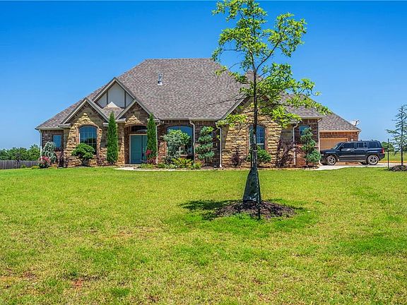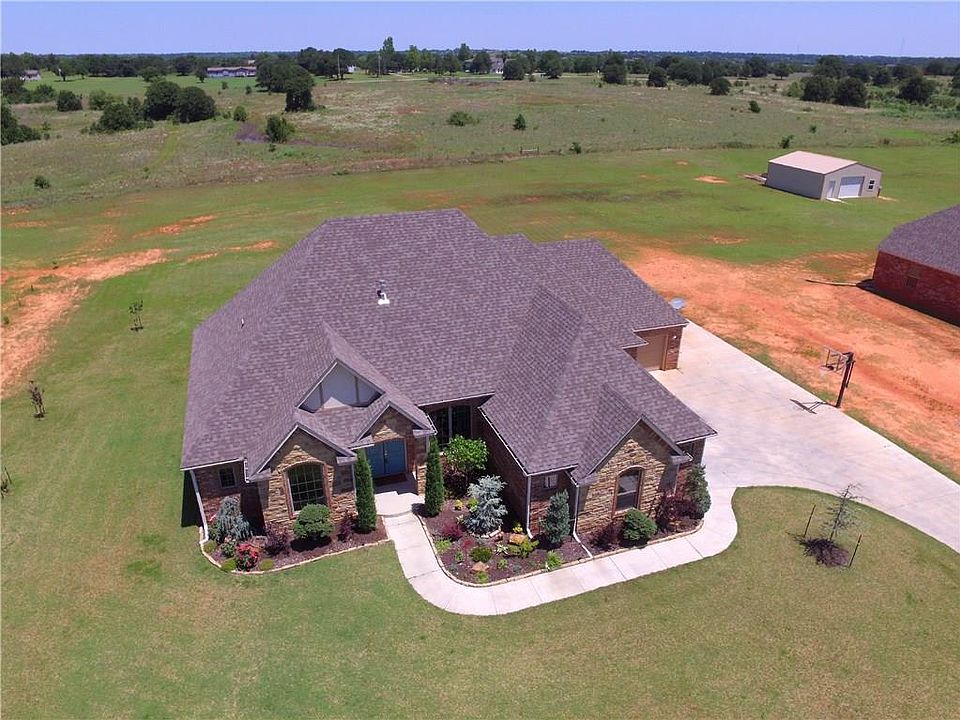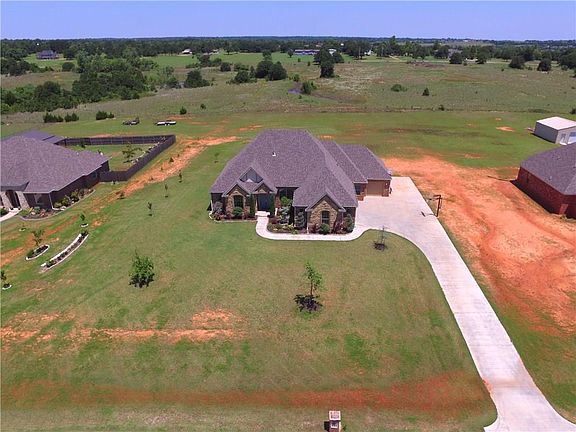 New Selling Price! Beautiful Curb and Architectural Design Captured on 1 Acre in Mockingbird Estates. Gorgeous landscaping and wide open backyard views! A perfect floor plan has 3 bedrooms, 2.5 baths and a study arranged for easy open living. Large kitchen has an oversized pantry, island, granite counters and eating space with view of the large backyard and spacious patio. Master bedroom has access to the large covered patio - hot tub stays with an acceptable offer! Master bath has all the features you would expect. The two other bedrooms share a large jack and jill bath. 3 car garage has great storage. City water and natural gas. There is plenty of room for a Workshop with a planned driveway for shop building access! If you need more room, there is an unfinished area for a bonus room upstairs. Located in North Blanchard, this property is located in a desirable addition with new homes and has close proximity to Norman, Mustang and the OKC Metro.