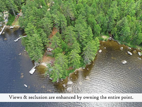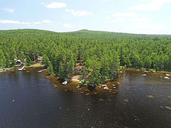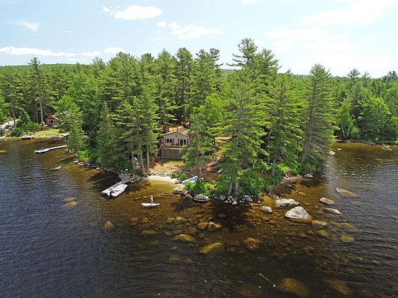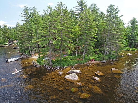 Iconic camp setting on perhaps the most enticing lot on beloved Molasses Pond offers much of what Maine lake living promises. Recent home & septic inspection reports available. The 1.39 acre lot is surrounded by towering pines and owns the entirety of a point, granting long views down the breadth of the pond. 340' of owned frontage includes two beautiful sand beaches, a boat launch area, frontage on Molasses Pond Stream & direct access to the unique setting of the MoPo dam. Swimming, fishing, boating...all of it can be done with ease from the shore here, which sports a shoreside sunning platform, dock and two moorings. Being both at the quieter southern end of the pond and within a sheltered cove keeps boating traffic to a minimum. One of the granite boulders that speckles the shoreline is large enough to lounge on or be that perfect fishing perch. An 'end of the road' location provides both a sense of privacy & seclusion, while also fully being a part of the lovely 'Cove' neighborhood, a true example of why camp living in Maine is so special. The humble, yet well loved 500 sq. ft., three season camp offers a kitchen, dining area, living room, full bath, bedroom & a small sleeping loft. New soils work done for potential new home in rear of lot. A 30% footprint expansion of the existing camp is possible. While modest in living space, the views from inside are anything but with the pond in full focus from most rooms. Step out to the deck and the 220+ degree, elevated water views come into full glory. To host everyone who will want to come visit you, the bunkhouse (with power), well crafted outdoor dining area, outdoor shower & laundry and pondside campfire pit are essential. An additional storage building helps to stash the needs for life on the pond. The property is supported by a modern septic system (inspected) and draws water from the pond with a newer pump & pressure tank. Plenty of parking is on site, as is Fidium internet access. Conveys mostly furnished.