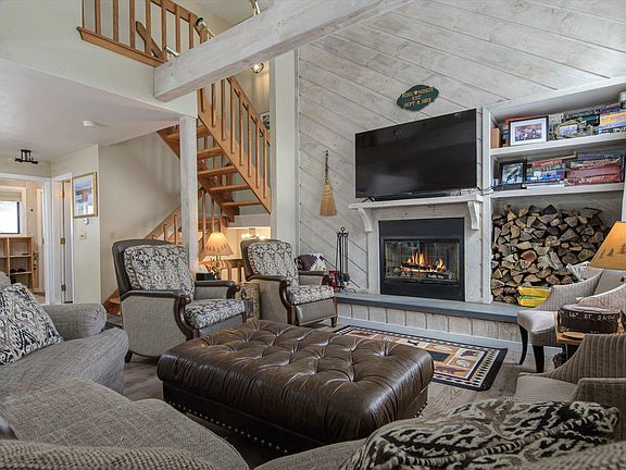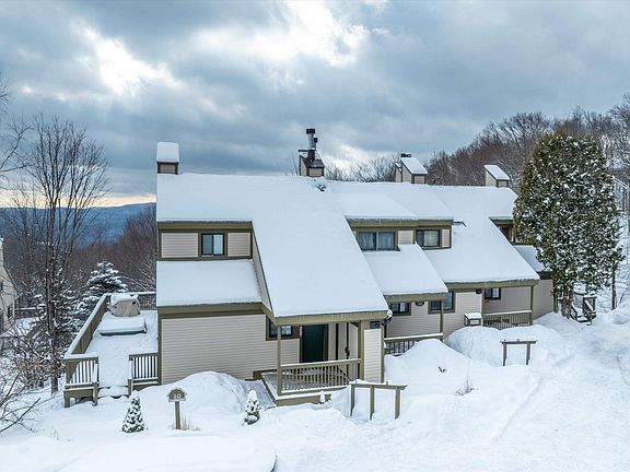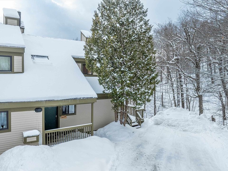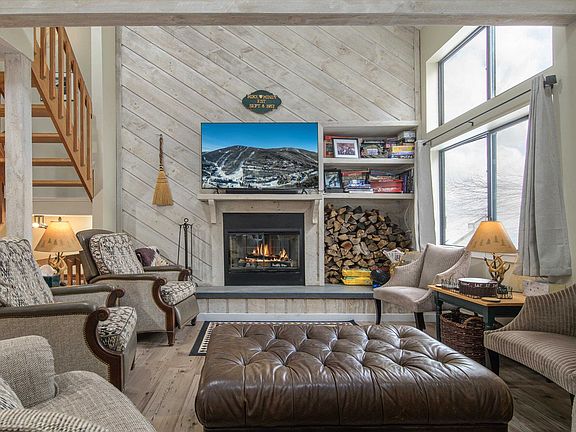 Rare private location overlooking a lovely mountain stream and just steps from the Sachem ski trail. Four bedroom townhome on sunny south end of the building offers an open floor plan centered by a wood burning fireplace and accented by a wrap around deck. Kitchen includes updated flooring and appliances. Separate dining room adjoins a spacious living room with open beam cathedral ceiling. Intimate primary suite on top floor includes a privacy balcony overlooking a peaceful wooded setting. Primary bath includes updated skylit whirlpool tub, glass enclosed shower, flooring, fixtures, and lighting. Three additional bedrooms, including one with woodburing fireplace, occupy the ground floor and include an updated bath and laundry room with slop sink, and cedar lined sauna. Mechanicals have recently been updated as well. Additional features include a rough sawn pine mudroom leading out to a rear deck with two private ski closets, and interior spaces accented by stone flooring.