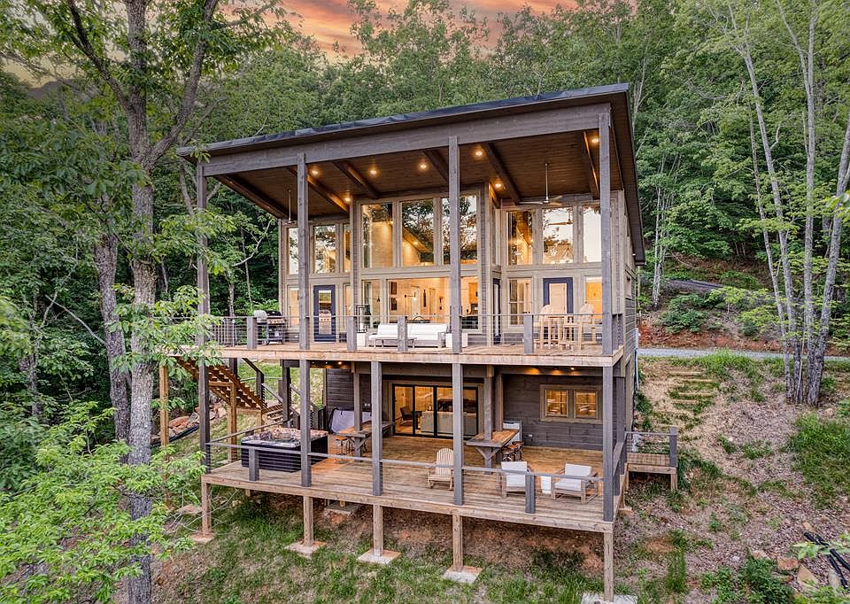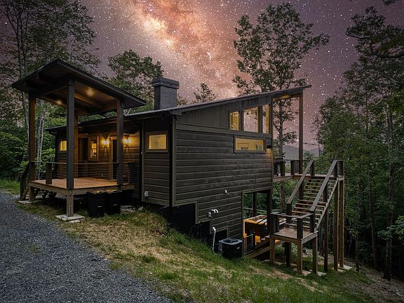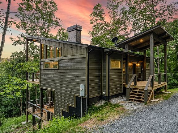 This stunning modern mountain cabin is a brand-new home, meticulously designed to provide the ultimate luxury retreat. Step inside and be greeted by high-end furnishings and an open-concept living space that seamlessly blends the kitchen, dining, and living areas. Tall windows frame breathtaking views of the Blue Ridge Mountains, filling the space with natural light and creating an inviting atmosphere. The gourmet kitchen is a chef's dream, complete with top-of-the-line appliances, a gas range, and a fully stocked pantry. A large dining table provides ample space for family meals or game nights, while the adjacent living area boasts a cozy fireplace and a 65-inch smart TV, perfect for relaxing evenings. The main level features two luxurious king bedrooms, each with its own ensuite bathroom and smart TV. Indulge in the spa-like master bathroom, featuring a walk-in shower with a multi-feature shower head, or unwind in the second bathroom's wet room with dual shower heads and a garden bathtub. Step out onto the expansive deck from either bedroom and soak in the serenity of the surrounding mountains. A convenient laundry area with a front-load washer and dryer completes the main level. Venture downstairs to discover another haven of relaxation. A spacious living area awaits, offering a 70-inch smart TV, an X-box, and a collection of puzzles and board games for entertainment. A third bedroom with a queen bed and 50-inch TV provides comfortable accommodations for additional guests, while a nearby half-bath adds convenience. Sliding doors lead to a lower deck, where you can unwind in the brand-new hot tub while enjoying the fresh mountain air. This cabin's thoughtful design extends to the outdoor spaces. A large veranda on the main level is nestled amongst the trees, providing a tranquil setting for enjoying the mountain views. The lower deck offers additional seating and easy access to the hot tub. Both decks are furnished with your comfort in mind, and a large grill is a