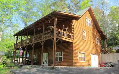Year Round Water with this Rustic Elegant Cabin tastefully finished with soaring cathedral ceilings, mountain laurel railings, beams, antler chandelier, beautiful floor to ceiling fireplace, mostly wood interior. Wonderful galley kitchen has granite counter tops, pantry, and black appliances. Also a hot tub and alarm system.The terrace level has a huge great/game room, a 2nd fireplace, and bath. Plenty of room for more beds on this level. Nice Lakeside decks. 2 Docks included. Quiet neighborhood road. Furnishings negotiable.