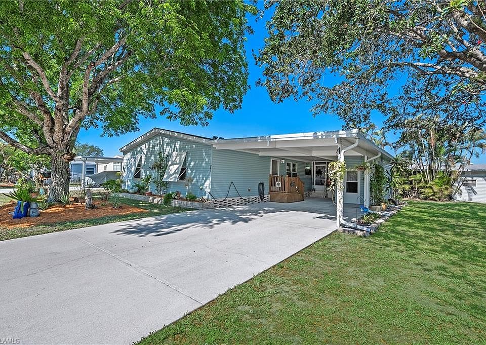 Fantastic opportunity in Riverwood! Amazing waterfront corner lot with spacious floorplan including 3 bedrooms & 2 full baths. This property features an oversized carport with new roof, updated kitchen with QUARTZ COUNTERTOPS and lots of custom shelving & storage solutions built in to the cabinets, a screened-in lanai, and a great location within the community with less traffic, and western exposure to take in great sunsets! This 55+ community is close to great shopping and dining options, and fees are only $198/year! Collier appraiser has the lot value at $140,699 alone! There is also a community boat ramp nearby...great for going fishing, kayaking etc. Don't miss out on this one!