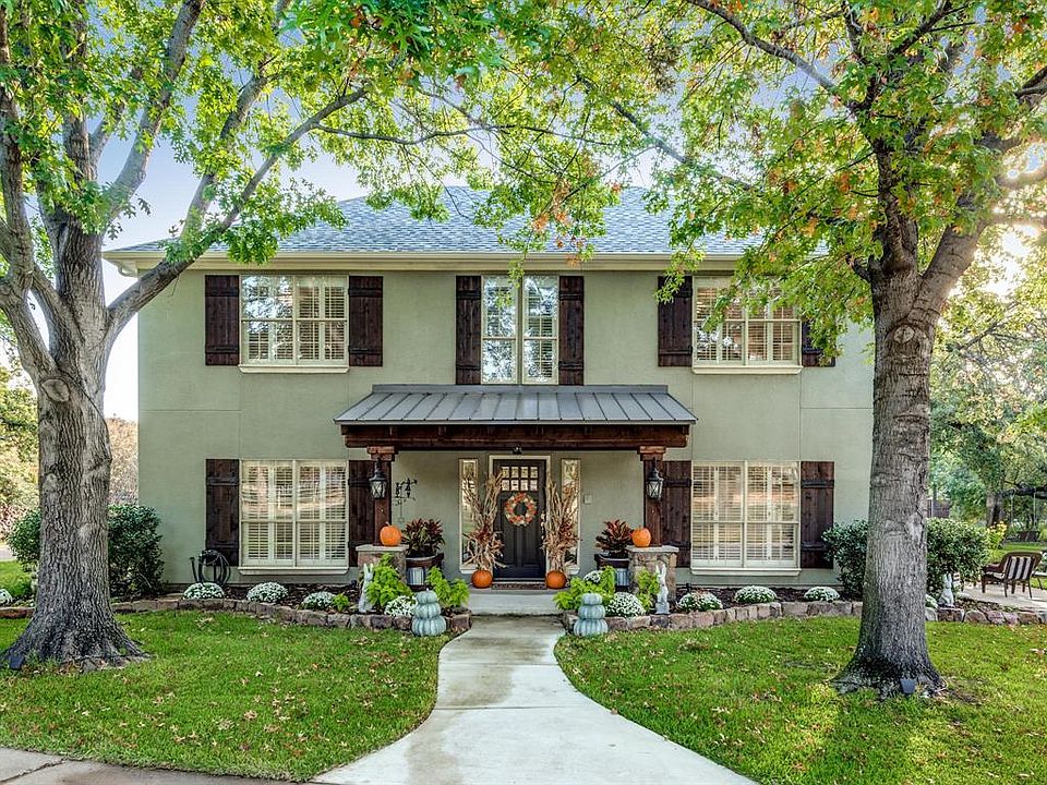 WELCOME HOME! Country Living Farmhouse on 1 ACRE featuring 4 BEDS + 3 BATH + STUDY! Enjoy the mature trees and lush landscape as you enter the home to an oversized Living area, a stone fireplace, as well as a study with built-ins. One guest suite and full bath downstairs - perfect for guests. The Kitchen boasts 42-inch white cabinets, granite countertops, stainless steel appliances, double oven and a gas cooktop island! Upstairs you will find 2 other bedrooms + Master suite with a fully updated bath! Interior upgrades include all new paint downstairs, Hard-Wood Floors, Crown Moldings, decorative light fixtures, wood shutters + so much more! Relax under the overzied cedar patio cover and stone fireplace!