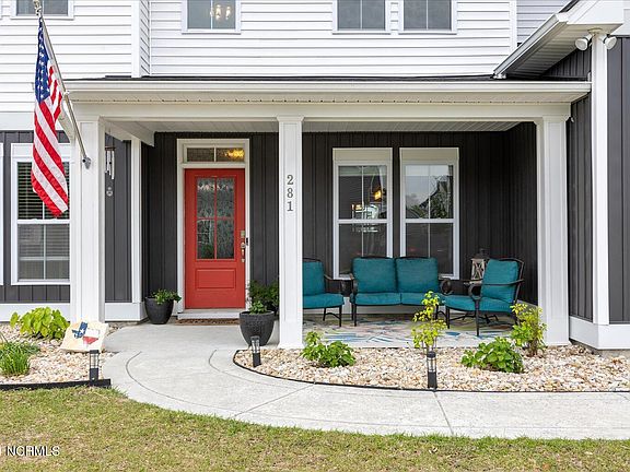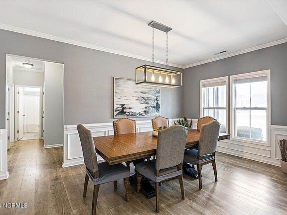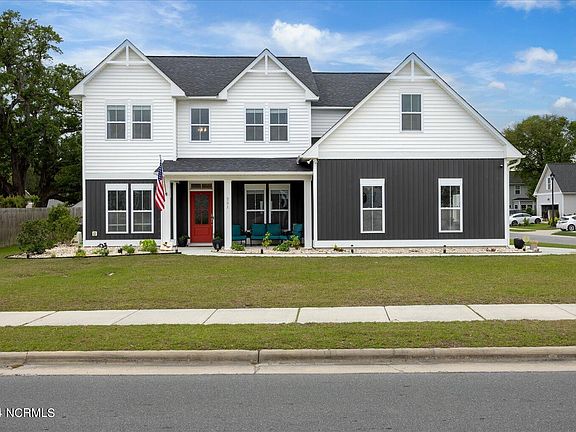 This is THE ONE! Come fall in love with this gorgeous and spacious home situated on a corner lot with a side load garage! Boasting FIVE bedrooms, PLUS an office, PLUS a flex room, PLUS a bonus room, you'll have plenty of room to work from home or to accommodate guests. As you walk into the foyer, the formal dining space is off to the right, while the home office is behind beautiful French doors off to the left. The family room, kitchen and informal dining space are open concept and wonderful for entertaining. The kitchen has an oversized island, farmhouse sink, gas stove, and a pantry full of customized shelving and drawers. The flex room off of the kitchen is currently being used as a fitness room, but the possibilities for use are endless! Around the corner from the kitchen you'll find a bedroom and adjacent full bathroom, which is a perfect guest space. Heading upstairs you'll find 3 more bedrooms, one with an en-suite full bathroom, and another full bathroom in the hallway. Down the hall is the enormous bonus or ''hangout'' room and the amazing laundry room complete with custom storage, shelving and hang space. The incredible primary suite completes the second floor, boasting a huge bedroom with vaulted ceilings, separate sinks, a bathtub AND shower, separate water closet, and a huge walk-in closet! Moving outside, the welcoming covered porch opens up to a large patio area, perfect for grilling and family gatherings. A regal southern oak overlooks the backyard, providing shade and that spectacular southern charm. Finally, the community pool, clubhouse and mailboxes are conveniently located just around the corner. Zoned for Topsail school district, so call your agent and schedule your showing quickly!