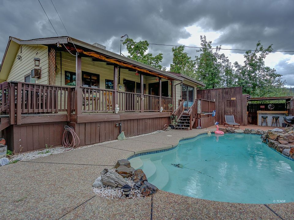Mountain Views & A Pool... This conveniently located 2 bedroom, 1 bathroom home is situated on a 0.16 acre corner lot in Lewiston & features an inground swimming pool. The living room boasts large windows, hardwood floors and is open to the kitchen. Down the hall you will find two bedrooms, bathroom and additional room, currently being used as a bar with sleeping area with slider to back deck. Kitchen offers mountain views and overlooks the pool too. Through the kitchen is a very large utility room, featuring washer/dryer and backdoor to outdoor entertaining area. Step out back to a raised deck offering amazing mountain views, overlooking the inground pool with a tranquil waterfall, hot tub area and built in bar making this backyard perfect for entertaining or relaxing after a long day on the lake, or fishing the beautiful river, or hiking in the alps...Home also features ample storage with a small workshop area behind the carport and fenced garden area. Options are endless at this location, just 30 minutes from Redding.