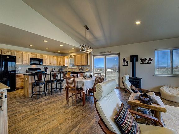 Delightful, practically new, one level home with over 1400 square feet, so well laid out, you will be delighted. Separated master suite. Open great room concept between the living room, dining area and kitchen, also with an island bar with eating space. Large slider to the side leads to a large covered patio, with great mountain views all around. Perfect layout, so you can store your grill in the garage and then roll it out to the patio for times you want to grill. Garage is extra large with 509 square feet that has the back entrance to the patio, extra storage space, two storage closets added which separate your things from the open garage, plus several sturdy overhead built-in shelving areas. There is carpet in the walk-in master closet, but everywhere else is an attractive wood-looking tile. It goes great with the hickory cabinets throughout and the attractive black granite countertops. Master bath has a generous wide countertop with storage underneath and a large tiled shower. Craftsman styled doors throughout. Stackable washer/dryer in wide hallway closet. Also a separate large pantry closet off the kitchen. Gas freestanding fireplace in the living room has a remote with programmable thermostat. The living room and master bedroom have vaulted ceilings. Kitchen sink has reverse osmosis. All the main rooms have ceiling fans. Low maintenance rock landscaping in the front allows you to think about a complete low maintenance yard without paying dues.