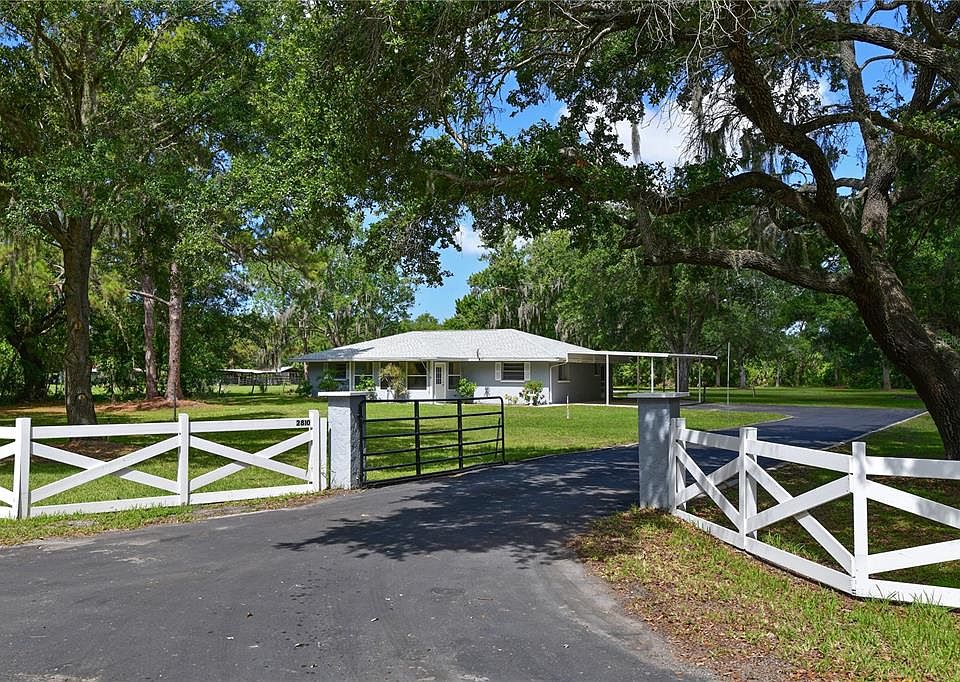 PEACEFUL COUNTRY LIVING WEST OF I-75! Come see this 3 bedroom/2 bath home on 2.5 acres. Zoned A-1 so bring your horses, chickens and pets. No HOA or CDD. With plenty of room to spread out and soak in the tranquil country lifestyle, this is the perfect place to plant a large garden, enjoy the beautiful old oaks or go fishing in the large pond on the backside of the property. No HOA or CDD. New roof in 2021. New septic system July 2022. Drive through the gated fence on the long driveway to ample parking for all your cars and toys, including your boat, RV and trailers. Enter the home through a large carpeted sunroom to an open living room and kitchen with lots of dining space. Split bedrooms put the master on one side with an en-suite bathroom and the secondary bedrooms on the other side sharing the second bath. A large sunny dining room/family room offers wonderful views of the property. The large barn offers plenty of storage space or could be converted for many uses. There is so much potential to enjoy "Old Florida" living in the heart of town. Close to I-75, Lakewood Ranch, shopping and dining, downtown Bradenton and less than 30 minutes to the beaches, downtown Sarasota or St. Pete. This is a rare opportunity to own a natural country setting close to everything!
