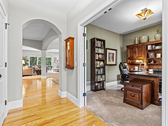 Nestled in a serene, wooded setting backing to Spring Lake Regional Park, this walkout rambler offers the perfect blend of comfort and style. Step inside to a warm and inviting floor plan featuring hardwood floors, arched openings, and abundant natural light. The kitchen boasts granite countertops, large pantry, a large center island, and custom cabinetry, ideal for both entertaining and everyday living. The adjacent living room includes a cozy stone fireplace and an expansive patio door that frames the beautiful wooded views. The main level offers a spacious primary suite with deck access, a dedicated office with French doors, and a convenient laundry room off the mudroom. The finished walkout lower level expands your living options with a family room, game area, theater space, and two additional bedrooms. The garage includes a workshop area. Recent updates include a new roof. Enjoy the outdoors on the expansive deck overlooking the trees, private patio, or take a short stroll to nearby trails and the neighborhood park. Thoughtfully maintained and updated, this home is move-in ready and offers a lifestyle of comfort, beauty, and convenience in one of Prior Lake’s most desirable settings.