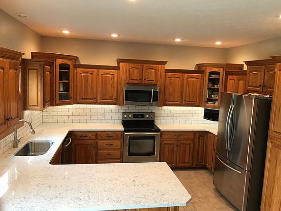 Updated kitchen and Fresh Paint throughout .Eat-in kitchen has stainless appliances and cabinet pantry with roll-out shelves and new quartz counter tops. Extras include raised ceilings, crown moldings, gas fireplace, newer carpet throughout & zoned HVAC. Master bedroom has vaulted ceiling, dual walk-in closets, jetted tub & walk-in shower. Large attic has walk-in access & partial flooring. Great county view from back patio—but just minutes from Hwy 65. This home is ready for you to move into!