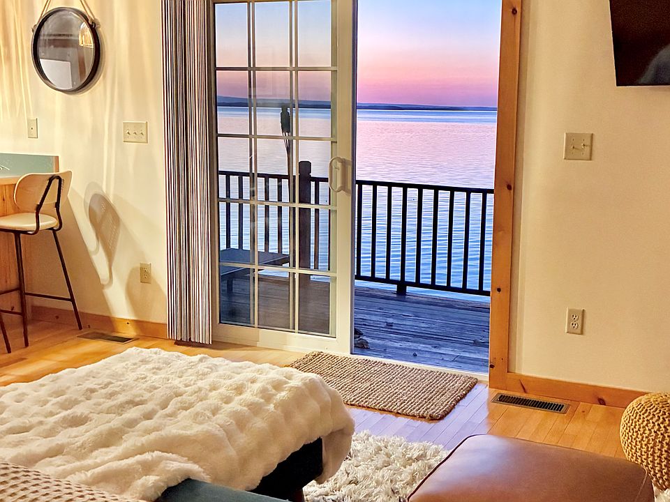 This two floor home has brand new furniture, beautiful hardwood floors, and stunning lakefront views. The top floor has a large eat-in kitchen, modern living room facing the lake, a king bedroom with large closet, a full bathroom, laundry room, hybrid office/gym/guest room, and a wrap around deck with lounge chairs and grill. Downstairs is a large second bedroom suite with a Queen bed, closet, its own living room and half bath, with private slider entry to lawn and waterfront. This is a biking, walking, boating & birding community of friendly neighbors, and just a 15 minute drive to Restaurants, shops & The Medical Center in St. Albans, and just 30 minute drive to Burlington. Pets are considered.