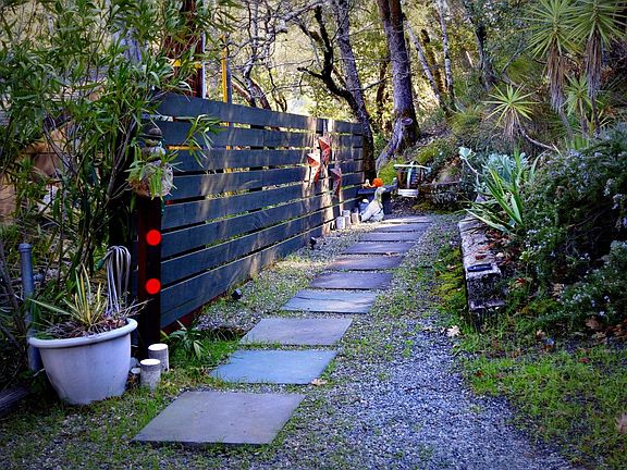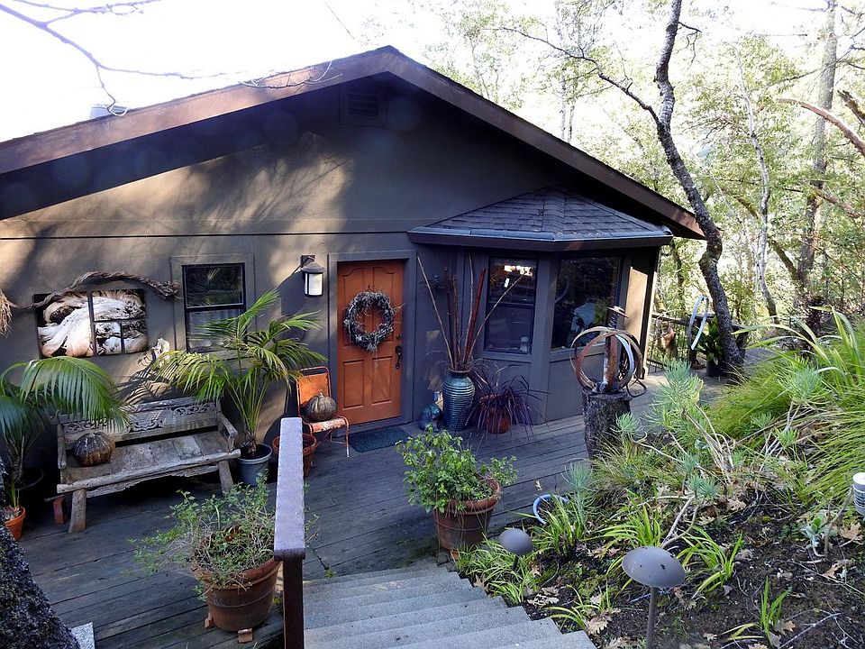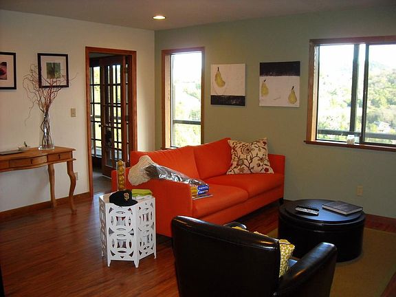 It is very private 1 bed , 1 bath 800 sq ft. The house is at the end of the street surrounded by woodlands that we own no other houses nearby. Private access down a short flight of stairs. Spacious kitchen and living room. Titled bathroom. French doors in the bedroom access a deck with beautiful views of the river and vineyards across. Internet cable is provided, as well as laundry room on the upper level. All utilities, heat and AC plus high speed internet , garbage and recycle are included . I use the upstairs for my home office and are rarely over here in the evening. We live in the garden house across the street. Designated parking for 1 car on our garage parking deck. The beginning of the hiking trail for the Fitch Mtn park is just across the street and Del Rio river park with access to the river is down the street.