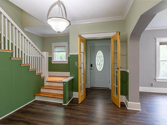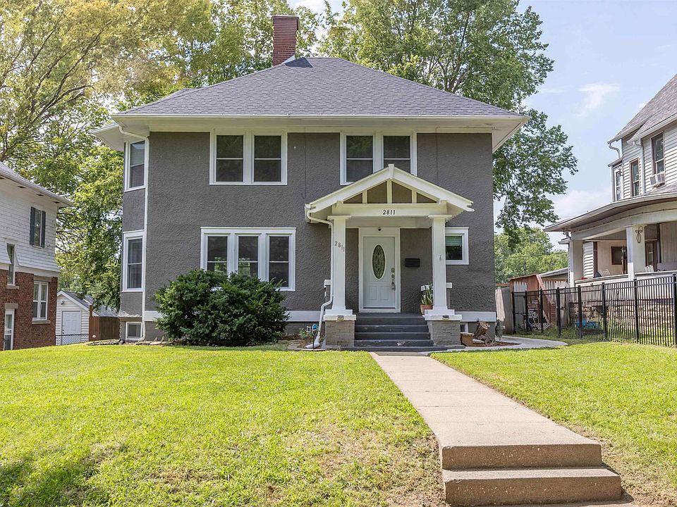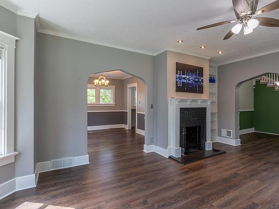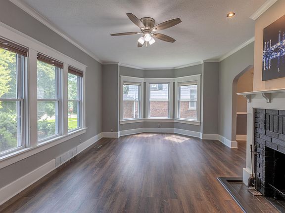 Located near Bryant Elementary School, this beautifully updated 4-bedroom, 2-bath home combines modern upgrades with timeless character, with the full remodel completed within the last 2 years. Improvements include new windows, roof, A/C, updated furnace, fresh interior and exterior paint, new doors, updated electrical and plumbing, stylish light fixtures, and brand new LVP flooring on the main level and in the basement. The inviting living room offers a brick fireplace, large windows, and abundant natural light, while the formal dining room features chair rails, textured wallpaper, and a ceiling fan. The completely renovated kitchen boasts new cabinets, counters, sink, appliances, a breakfast bar, pantry cupboards, and a separate pantry area for extra storage, with a mudroom leading to a remodeled deck perfect for entertaining. The spacious backyard is partially fenced with a new concrete walkway along the north side and a one-car garage. Upstairs, refinished hardwood floors and original woodwork, including the staircase, highlight generously sized bedrooms filled with natural light, along with a full bath showcasing a new double vanity, tub, modern tile, and fixtures. The finished basement offers a large living area plumbed for a bar, a laundry room with built-ins, and a stunning second bath with a double vanity, oversized shower, and modern tile, plus extra storage for the furnace and water heater. Move-in ready with 1916 charm, this home is ready to go. All room sizes are approximate.
