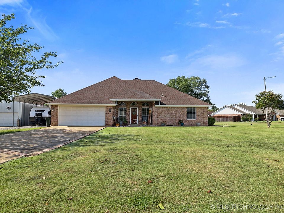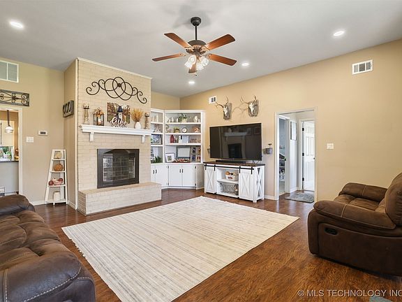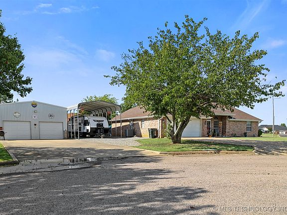 Step outside and the property truly shines. A large 24W×36D×12H shop with electric garage doors and loft storage provides room for hobbies, parking, or projects. Two additional storage buildings (12×16 and 10×10) keep tools and seasonal items organized, while a double concrete drive and tall RV carport with 30-amp plug make space for every vehicle and toy. A storm cellar adds peace of mind during Oklahoma weather.