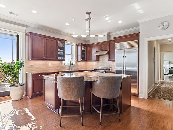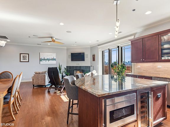ON A CLEAR DAY... YOU CAN SEE FOREVER. Elegant, Exclusive, Exquisite! Come fall in love with this HIGHLY upgraded 3-bedroom Penthouse with its own 70 ft south facing Hardy board patio with spectacular views of the city and River. Located in a newer elevator building in the heart of Chicago's vibrant Logan Square neighborhood along the Chicago Riverwalk. Open floorplan boasts 9.5' ceilings and floor-to-ceiling windows. Beautiful hardwood floors throughout. Bright and airy, the gracious Living Room/Dining Room with Balcony is open to the expansive Designer Kitchen. This Open Concept is perfect for entertaining! State of the art Chef's kitchen, includes SubZero refrigerator, Wolf gas range, microwave drawer and SubZero wine refrigerator, Kitchen also boasts high end custom cabinetry with granite counter tops. Dreamy and inviting, the large Primary Suite is beautifully decorated and boasts a walk-in closet with custom organizers. Primary Bath features marble counters, jetted tub and separate shower. In-unit side-by-side Washer and Dryer with convenient storage space and mud room. Luxury Meets Design! The entire home has been beautifully decorated creating an atmosphere of warmth and sophistication! Prepare to be amazed! Beautiful millwork, surround sound, custom light fixtures and window treatments plus much more. Newer Marvin sliders (2023) to patio. Unit includes indoor heated garage parking along with a storage locker. Elevator building makes penthouse living easily accessible. Guests can enjoy visiting with parking pass. Love where you live! This is the ideal location, close to everything! I-90, public transportation, Bucktown shops, Logan Square restaurants, night life and entertainment are all close by. The beautiful Chicago Riverwalk it's a stone's throw away. It's a perfect place to call home!