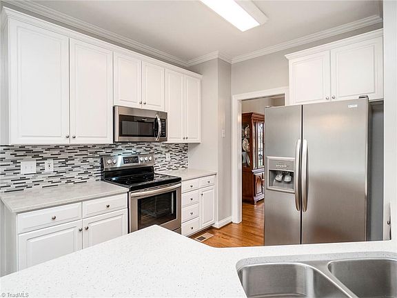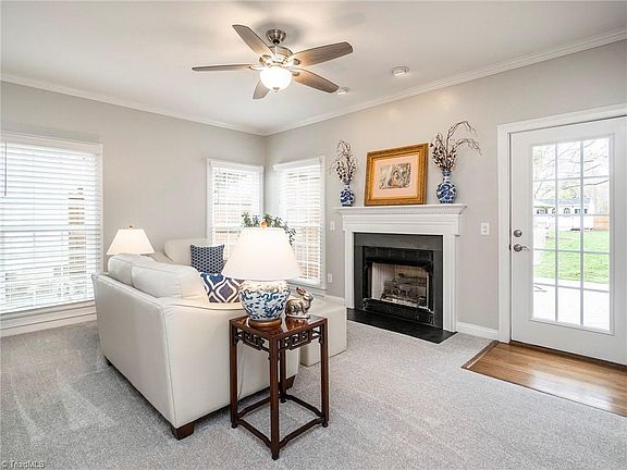 Move in ready! Spacious family room w/ gas log fireplace. New carpet throughout, kitchen w/ new stainless steel appliances, quartz counter tops, updated tile backsplash. Large primary bedroom w/ tray ceilings. All Pella Windows. Updated vanities and fixtures in bathrooms. Refinished hardwoods. Home office space. Spacious bedrooms. Neutral paint colors throughout. Fully-fenced flat backyard. Large deck & gorgeous paver patio. 10x14 storage building. Garage. Oversized driveway for parking. Call or Text 336-525-1289