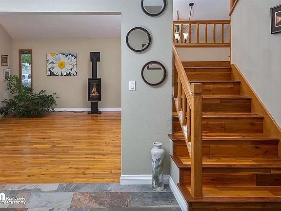 COMING SOON! Welcome to your new home just a short walk from Rabbit Creek Elementary and other top rated South Anchorage schools! This four bed, three bath custom built home includes hand scribed Acacia wood flooring and soaring ceilings in both the downstairs living and dining rooms. The sizable and well-laid out kitchen is complete with a brand new dishwasher and refrigerator, along with cherry soft-close cabinets, quartz counter tops, and heated tile floors. You'll stay plenty warm in the winter with backup heating options if the power goes out including a Jotul gas stove in living room and a wood burning fireplace in the family room. The airy master bedroom looks out over a peaceful wooded green space and the remodeled master bath boasts a deep soaking tub, an oversized shower, and heated floors. The spacious backyard is fenced and includes a shed, a two-tiered deck, and tons of privacy. You have ready access to running and biking trails just steps from your backdoor and a two car garage with a third space for an RV in the driveway. Not pictured - brand new appliances, windows, blinds, and exterior paint. Available for rent July 18th. Come see this beautiful home before it's gone! Tenant responsible for gas, electric, water, waste management, and snow removal. Pets considered on a case by case basis for an additional fee.