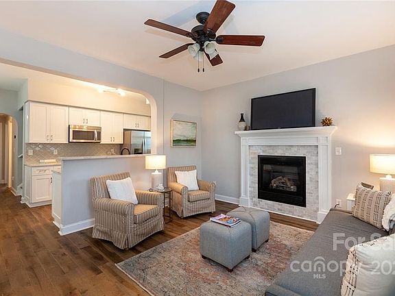 Relax on your rocking chair porch in this cute-as-can-be craftsman in NODA. The living room has a gas fireplace with marble tile surround and opens to the renovated kitchen with white cabinetry, stainless appliances and quartz countertops. It connects with the bay window dining room with access to the backyard. A big plus, there's a first floor bedroom and full bath. Upstairs, there are two more bedrooms and two baths (both updated), including the spacious primary with walk-in closet, and bath with dual vanity, tiled shower/tub and built-in shelving. Super convenient, the laundry is upstairs, just outside the bedrooms. Wood flooring throughout, no carpet. Central location off of Matheson, with easy access to Midwood, the light rail and all the Arts District has to offer. Welcome home!