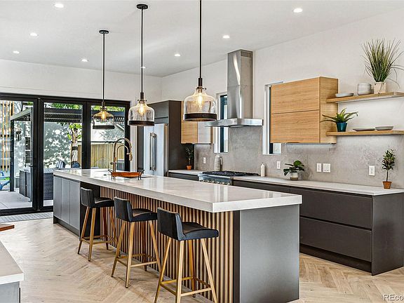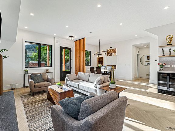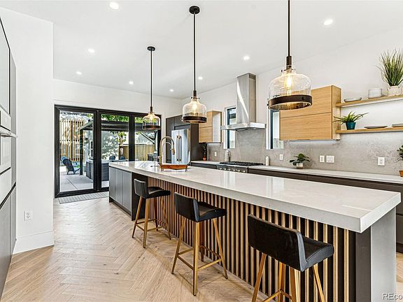 Stunning new custom home in Newlands! The majority of the home is brand new including the main foundation, w/ the remaining part taken down to the studs blending character w/ all the amenities of a new build. The original Boulder red stone was saved, restored, & reused, adding a unique touch to the home. The main floor features 10 ft ceilings & an open floor plan from front to back. There's a large designer kitchen & island w/ Thermador Appliances, custom made Euro imported cabinets,& High end Quartz counters. The living room has a gas insert fireplace & custom tile. Gas fireplaces w/ custom surrounds are also in the basement & primary bedroom. Natural light streams through from front to back w/ large all new Anderson 400 wood windows & a glass folding wall. The 2nd floor features a large primary suite w/ a custom accent wood ceiling, a large 5-piece custom bathroom, inc a free standing soaking tub, oversized shower w/ a frameless glass door, & custom double vanity. It also has a bar w/ a beverage fridge, & balcony w/ stunning views of the Flatirons & Mt Sanitas. There are also two different basement spaces. The main basement area has a large rec space, with a wet bar, a beverage fridge, & a gas insert fireplace w/ custom tile. It's large enough so that an extra bedroom could be framed in. The other basement area can be used as a dual space 2 car garage or rec space. It has a separate staircase, Modern H/E glass garage doors, & epoxy concrete floors. It serves well as a living space or garage. Outdoor spaces inc a large fenced front yard & great backyard patio space w/ a black pergola, gas firepit, & built in gas grill; in addition to the primary balcony w/ views of the Mtns,.New detached 1 car garage (in addition to 2 car) w/ 14 ft ceilings & a 12 ft door to fit a sprinter van, car lift, or storage. Great block on a 1 way street only 2 blocks from North Boulder Park. New Expensive Solar Panels fully paid for provide great energy savings.Matterport 3D tour available