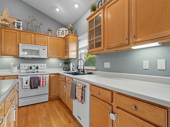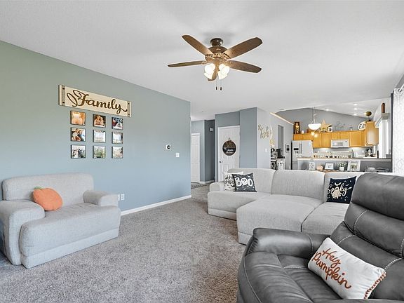 This 3-bed, 2 ½-bath home offers a spacious, sun-filled layout with a vaulted ceiling and an open main level. The kitchen boasts maple cabinetry, hardwood flooring, a large island and nook, plus a stylish farmhouse sink and new island lighting. It flows into the great room, where a gas fireplace creates a cozy focal point. Adjacent to the kitchen, a versatile front room currently serves as a play area—perfect for toys, hobbies or an office. A convenient half bath completes the main floor.