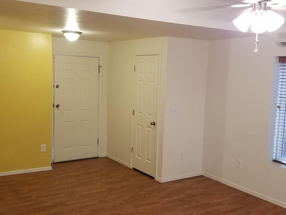 This spacious front of a duplex features hardwood and tile flooring, ceiling fans in living room and master bedroom. High tech and efficient air conditioning/ heating With a huge kitchen and very large living room- all windows have upgraded wooden blinds. You have a laundry room with washer and dryer (only for your use, not shared with other half of duplex) . On the outside, you have a nice sized private patio with an enclosed yard and a water misting system. A 10' x 12' tuff shed is also on your property for your storage needs. Your enclosed yard is double gated and privacy slats on the six foot fencing. Completely remodeled only 2 years ago, everything about this home is fresh and very nice. RENT IS TO BE $974/month- ALL OF THE UTILITIES. 1 year lease: Rent is $974/mo. with ALL UTILITIES PAID FOR BY THE HOME OWNER. A deposit equal to 1 months rent ($974)