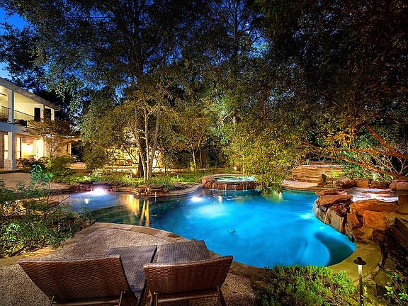 Magnificent transitional custom home on 2.35 acres in Benders Landing! Oversized 5 car garage + 2 car porte-cochere ensures plenty of parking! Charming covered front porch, European white oak hardwood flooring, stunning light fixtures, abundant windows and detailed trim work throughout. Study with French doors, decorative brick and built-in bookshelves; The open concept island kitchen is truly the heart of the home with quartz counters, breakfast bar, walk-in pantry and double oven, overlooking the breakfast room and den with gas fireplace; wine grotto and butler's pantry; owner's retreat with sitting area and game room (or media) down; 4 bedrooms and 2nd game room up with kitchenette and balcony; resort style backyard has fabulous pool with waterfalls, spa, outdoor fireplace, kitchen, lanai, barndominium, covered patio and mosquito misting system. Wow!
