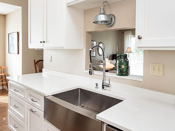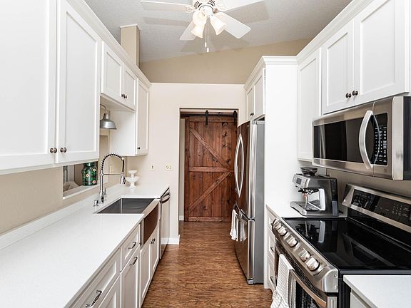 The heart of the home is the remodeled kitchen, featuring custom soft-close cabinetry, quartz countertops, and a farmhouse sink. Updated flooring and trim throughout add a fresh, modern feel, while the accent barn door brings warmth and character.