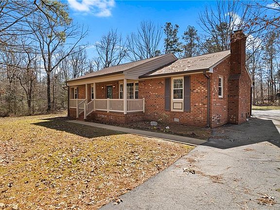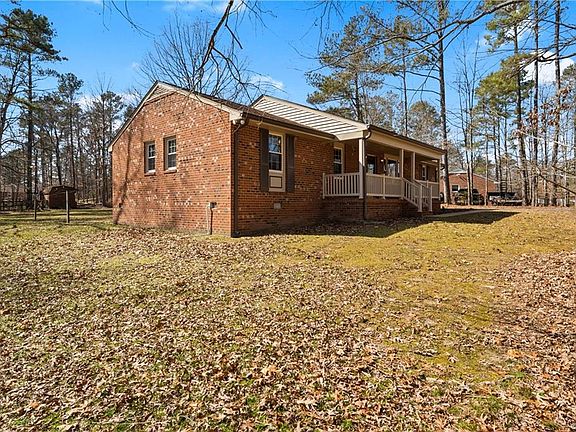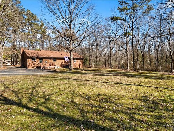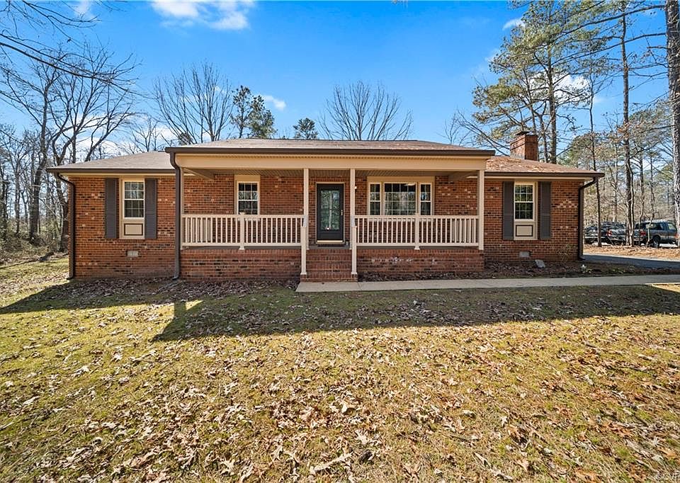 You are going to LOVE this low maintenance, all brick, ranch style home. It is perfectly situated at the end of a quiet cul-de-sac on a 1.4 ACRE lot in the sought after Old Mill Estates neighborhood. As you pull onto the paved driveway you will find plenty of privacy backing up to undeveloped land and the Virginia Capital Bike Trail. Features/Upgrades include; NEWER HVAC (2014), NEWER Vinyl energy efficient double paned windows (2016), Freshly painted interior (2021), Detached shed with electricity and so much more. As you enter the home, you are greeted with gorgeous true hardwoods throughout with a large office/flex room off of the foyer. The eat-in kitchen leads to the large living room boasting a brick fireplace. There is a dedicated laundry/mud room off of the kitchen leading to the back deck. The primary suite has a full ensuite bath and walk in closet. Bedrooms 2 & 3 are both generously sized and share a hallway full bathroom. The pulldown attic offers TONS of floored storage space. The back yard is massive and great for outdoor entertaining. NEW deep drilled well was installed in 2007. Just power washed & professionally cleaned for your convenience. 1 owner home.