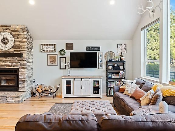 This Gorgeous Home has it all; 4beds 3.5baths, 3 car garage and fire sprinkler system on 2.84 acres. The vaulted ceilings, large windows, hickory wood floors and a stone fireplace are the center point of the home. The open concept is great for entertaining and has the perfect flow for a large or growing family. The kitchen is bright and airy with beautiful granite and high end appliances. The master bathroom features fancy anti-fog mirrors with diming lights. Two of the bedrooms have a large Jack-and-Jill bathroom with 2 sinks and a pocket door separating the toilet and shower for extra privacy. Upstairs has a half bath and a nice size room that has endless possibilities. The laundry room is nicely located right off the 3 car garage and kitchen. The property has a state of the art chicken coop and garden area ready to go for this years crop. The large backyard is fenced (automatic sprinklers), but also includes a play ground structure, a tree house and a half size basketball court; this is what little kids dreams are made of. Come live your best life and start creating your own memories.