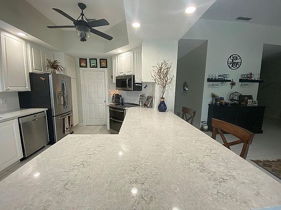 Florida living at its best! This extended Oakmont model home has everything you could want and more. From the whole-home solar system and brand new roof to the screened-in, custom Pebble Tec pool with travertine pavers! This home has it all. An ideal open-concept floorplan, with the family room, dining room and completely updated kitchen is perfect for family gatherings or entertaining. The kitchen has stainless steel appliances and Caesarstone quartz countertops. As you enter the home, you’ll immediately be impressed by the soaring 12 foot ceilings and stunning view of the tropical, custom pool with waterfall and lake just beyond the screened patio. Pebble Tec Pool (lifetime guarantee) Stacked-Stone Waterfall Travertine marble pavers Energy-efficient home: Whole house solar system, so no worries about rising electricity costs New Hybrid Hot Water Heater Energy-efficient pool pump-New High Efficiency washer/dryer Nest Thermostat Recessed LED Lighting Newly remodeled Kitchen with: Stainless steel energy efficient appliances Brand new Caesar stone Quartz countertops 2-Car Garage with: 1 year old Hurricane-strength garage door New Epoxy-Coated Garage floors Overhead shelves New driveway Miscellaneous Accordion Hurricane Shutters New screen door Fans in all rooms French doors to lovely landscaped side yard The 600 Acre Community is incomparable having 200 Acres of Lakes, 12 miles of Pedestrian Walkways with Cobblestone Bridges, Park Benches & Street lamps! Security Patrol, an Exclusive 24 Cable Channel to find out what is going on & there is a lot! The Town Center, has All The Amenities including 3 Heated Swimming Pools (1 Lap Pool, 1 Adult & 1 Resort), 8 Har-Tru Lighted Tennis Courts with an on site USPTA Pro on Staff & a Pro Shop, a Fitness Center, a Bocce Court, Tot Lot, a Post Office, Plus Recently Opened to Rave Reviews Centanni Cafe , a Genuine Italian Restaurant in the Town Center, run by a Chef with over 20 years Experience