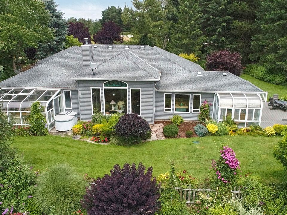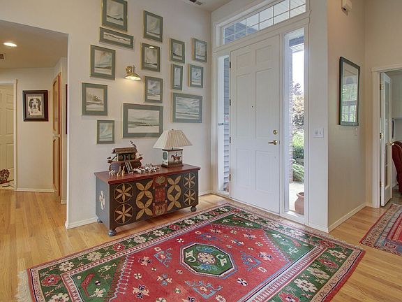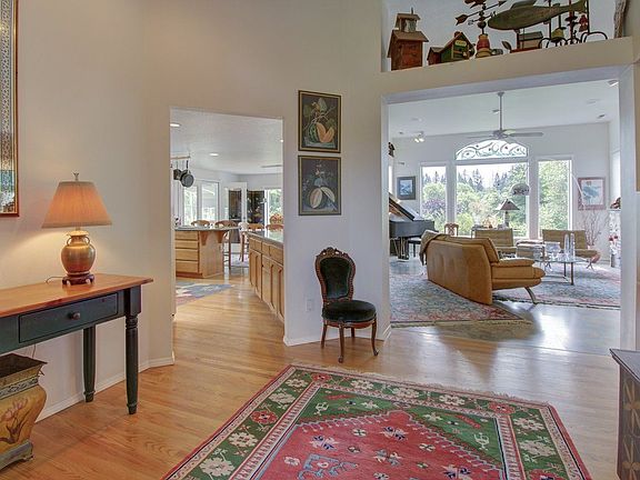 Paradise Surrounds You in this One Level Exquisite Estate! Your own private oasis filled with wildlife, pond, berries, fruit trees. Enter this bright open floor plan with 11'ft entry. French doors lead to a peaceful master suite, HW flrs, Corian/tile counters, surround sound, fireplace, Hollywood Bath between 2BD, FP, custom builtins, French drs lead to cozy sun-rooms, 2 eating bars. Pro landscaped w/sprinklers, deck, 3 Bay over-sized garage & barn. 5AC zoning/potential building site!
