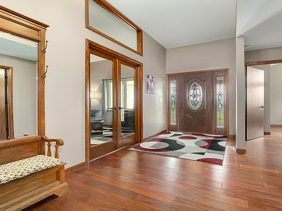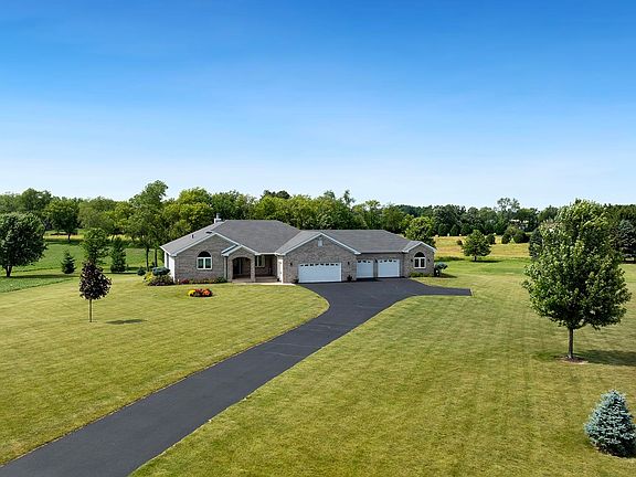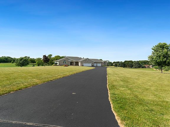 Discover unparalleled luxury in this custom-built home by Jason Wigget Construction, Inc., boasting over 4,700 square feet of combined living space on a serene 5-acre lot. This exquisite residence offers a spacious living room filled with natural light from abundant windows, creating a warm and inviting atmosphere. The large entryway welcomes you, while the heated and insulated garage ensures comfort and convenience year-round. The meticulously landscaped grounds by Crimson Ridge enhance the property's curb appeal, complemented by TSR epoxy-coated front steps, sidewalks, and ramp. The driveway, seal-coated in 2022, features a salt/supply chute to the basement from the garage for added practicality. The main level includes two bedrooms and two bathrooms, featuring a luxurious master suite with a tray ceiling, walk-in closet and a private en-suite with a separate shower, and a jetted tub. A handicap-accessible front bedroom suite, bathrooms and wide hallways adds to the home's versatility. The first floor also includes a convenient laundry room and a half bath. The walkout lower level is perfect for entertaining, with a family room, wet bar with a built-in wine fridge, a third bedroom with an en-suite bathroom. The covered back deck provides a tranquil outdoor space to enjoy the peaceful setting. Additional amenities include a wood or gas fireplace in the living room, a tankless water heater, and a massive four-door attached garage, heated and insulated for ultimate functionality. This home offers a perfect blend of elegance, comfort, and accessibility in a picturesque rural setting. Embrace the lifestyle you've always dreamed of in this beautifully designed, meticulously maintained custom home, where every detail is crafted for your comfort and enjoyment.