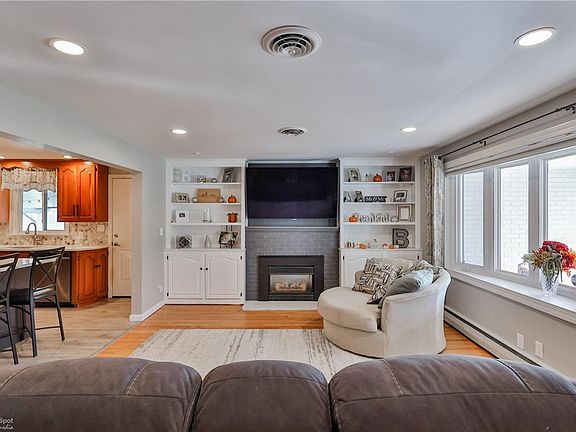 ****Multiple offers received. H&B by 10pm Monday Oct 21st**** This beautifully updated home is packed with modern amenities and thoughtful renovations. The kitchen has been transformed with new vinyl plank flooring, a sleek stainless-steel dishwasher, and an elegant island with quartz countertops and a stylish tile backsplash. Recessed lighting brightens the space, with pendant lighting adding a warm touch above the island. The living room boasts refinished hardwood floors, a gas fireplace with a stunning quartz hearth, and dimmable recessed lighting to highlight the custom built-ins. The fully remodeled bathroom features frosted glass, updated tile flooring, a subway-tiled tub, and improved ventilation with both an air conditioning vent and exhaust fan. In the primary bedroom, you'll find a spacious walk-in closet with a pocket door for privacy and a ceiling fan for comfort. The remodeled basement offers recessed lighting, electric baseboard heating, and new windows throughout the home. Major system updates include a new boiler with water softener, a Remi air-purifying system, and retrofoam insulation. The exterior has been freshly painted, with a sealed driveway, new garage door and opener, a radon mitigation system, and enhanced landscaping with Green Giant trees for added privacy on a fenced in double lot. The stamped concrete porch features new railings and steps, completing this home's comprehensive upgrades.