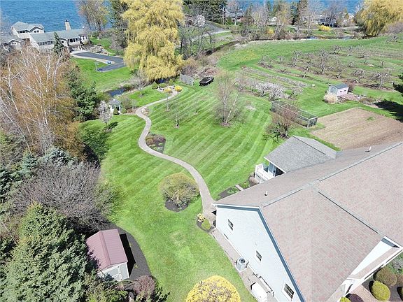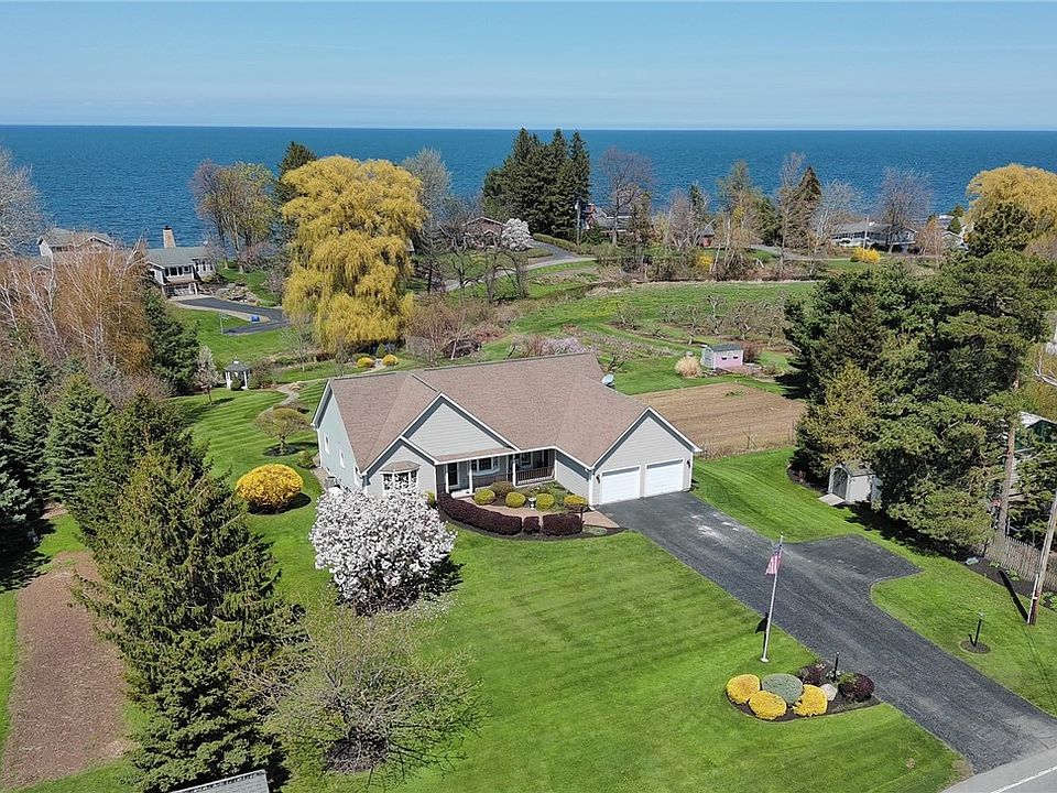 Gorgeous Contemporary Ranch with Lake Ontario views & spectacular sunrises! Surrounded by orchards and just a short distance to historical Pultneyville- Yacht Club, marinas, Forman's Park, wineries & farm markets! Features an open floor plan, hardwood floors, cathedral ceilings, gas fireplace, dining area with custom kitchen & plenty of cabinets & all appliances included! Sliding glass door opens to Florida room overlooking beautifully landscaped back yard, stream and lake! First-floor master suite with HUGE walk-in closet situated on eastside of home, other two bedrooms & full bath nicely set on opposite end of home. The 2.5 car attached garage leads to a mudroom and first floor laundry. Partially finished basement with 2nd kitchen, full bath, large rec room, spare room, large workshop and storage area with a walk-out at ground level. Set on beautifully landscaped parcel with brick walkways, private patio and gazebo with sitting area overlooking small stream that empties into the lake! Additional features incl central air, back-up generator, leaf guards & shed. Delayed negotiations, offers due May 9th at 3pm, please allow 48 hours for response, Open House Sunday May 7th 1-3pm!