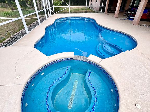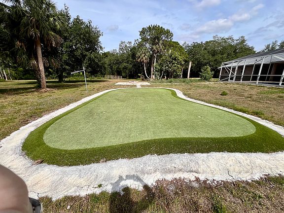 Large 3/3 home with high ceilings, screened, heated pool and jacuzzi, fenced 1.5 acre yard with putting green.