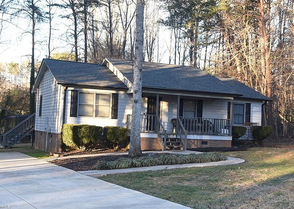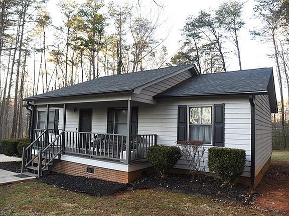 This charming 3 bed/2 bath, 1144 sq. ft. home is located conveniently close to both Wolfspeed and the new Toyota mega site. Many updates. Freshly painted outside with wood siding, new roof, gutters and back deck complement the new concrete driveway and sidewalk. Peaceful wooded lot. Home also includes new HVAC unit with primary bath remodel including new tile and Bluetooth shower head. New flooring throughout the kitchen and living room. Beautiful lit home with a neutral color palette. Property also includes an outbuilding with new gutters and double doors for easy entry.
