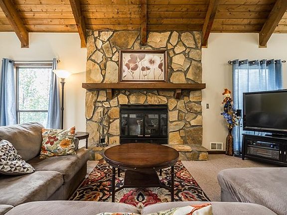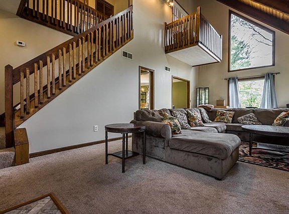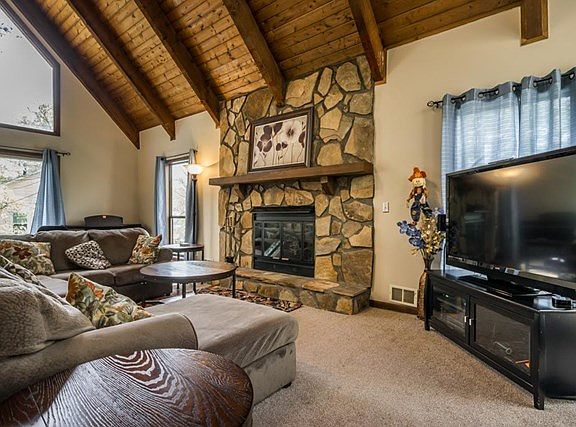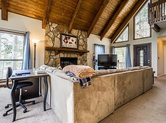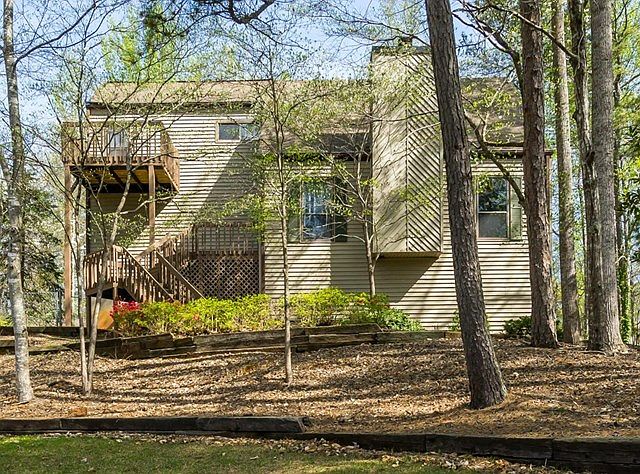 Sought after Pope HS district. Bedroom on main level with updated full bath. Open and vaulted fam room with exposed beams and rock fireplace. Separate dining room. Remodeled kitchen w/white cabinets, designer tile backsplash, granite countertops, stainless appliances, large pantry, and island. Neutral paint throughout and newer carpet. Vaulted mst bedroom with its own balcony and barn door to mst bath. Screened porch overlooks private backyard also features a dog run fenced area. Easy to maintain vinyl exterior.