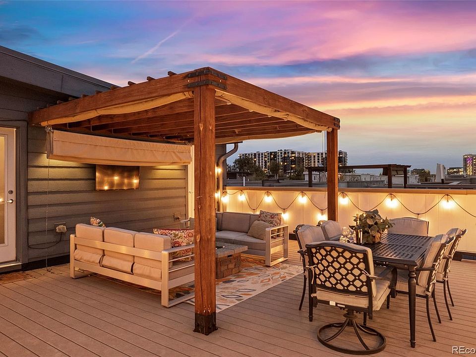 Now for a real urban delight. Up the stairs, and you won’t believe the outdoor living room on the rooftop deck! Here you are offered unbelievably beautiful views of the city, of the mountains, of Mile High stadium. The stylish patio furniture and the gas firepit could be included. Enjoy morning coffee, cocktails at dusk, or in any weather or anytime of the day, as there is a pull out tented roof under the pergola, and this is the place to enjoy fireworks over the city in the summer.