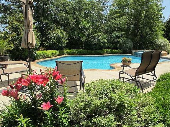 Stunning golf course property offers a swimming pool / hot tub, gorgeous mature trees, landscaping both front and back, and all of this backs up to the 6th hole tee box, plus great open greenbelt space. Elegant interior offers an open kitchen to family room, separate formal dining, newly refinished hardwood floors, granite counter tops, stainless steel appliances, built-in Hutch in oversized dining area, large enough to accommodate a 10' table. Walk in Pantry, large island with a vegetable sink and cookbook storage. Large utility room with tons of storage, space for extra refrigerator with a side entry off of the driveway. Living areas have beautiful crown moldings and built-ins. Study has hardwood floors & built-in bookcases. Master offers jetted tub, walk-in shower, double vanities, large walk-in closet with built-ins. Upstairs presents one private suite, two bedrooms with Jack and Jill bath, separate vanity area, two large bonus rooms. STORM SHELTER inside garage.NEW ROOF JUNE 2017